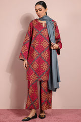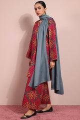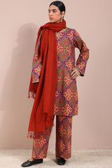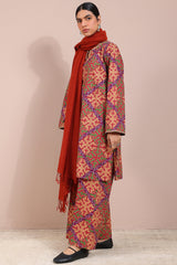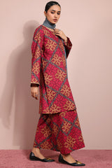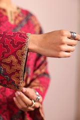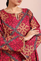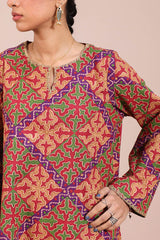 Printed classic-fit shirt with a round neckline and V-slit, adorned with delicate embroidered details on the neckline and sleeve hems. Paired with matching printed culottes for a coordinated look.