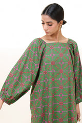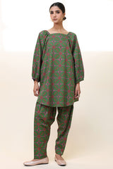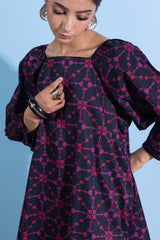 Classic-fit printed shirt with a square neckline and soft puff sleeves, finished with cinched hems. Designed in a chic boxy silhouette with a rounded hem for a refined look. Paired with matching printed pegged shalwar.