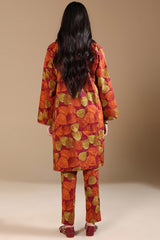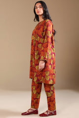 Classic-fit A-line paneled printed shirt with a round neckline and V-slit, adorned with delicate embroidery along the neckline and sleeve hems. Paired with matching printed straight-fit trousers.