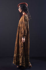 A long, flared printed dress with a round neckline, designed with soft gathers at the waist to accentuate its graceful flare. Gathered sleeve hems add delicate structure and a refined finish.