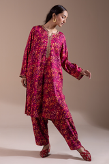 A classic-fit printed shirt with a round neckline and V-slit, adorned with delicate embroidered detailing along the neckline and sleeve hems. Paired with a matching printed classic-fit shalwar.