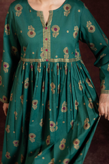 A long flared gold-printed dress with a round neckline and V-slit, adorned with buttons along the front slit. Soft gathers at the empire waist create a graceful, flowy silhouette.