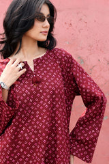 An A-line printed shirt with a round neckline and V-slit, adorned with tassel detailing. Paired with matching printed culottes for a coordinated look.