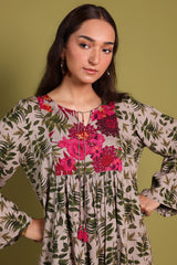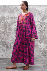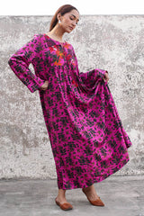 A long flared printed dress with a round neckline and V-slit, adorned with tassel detailing. Designed with gathers for a soft, flowy silhouette.