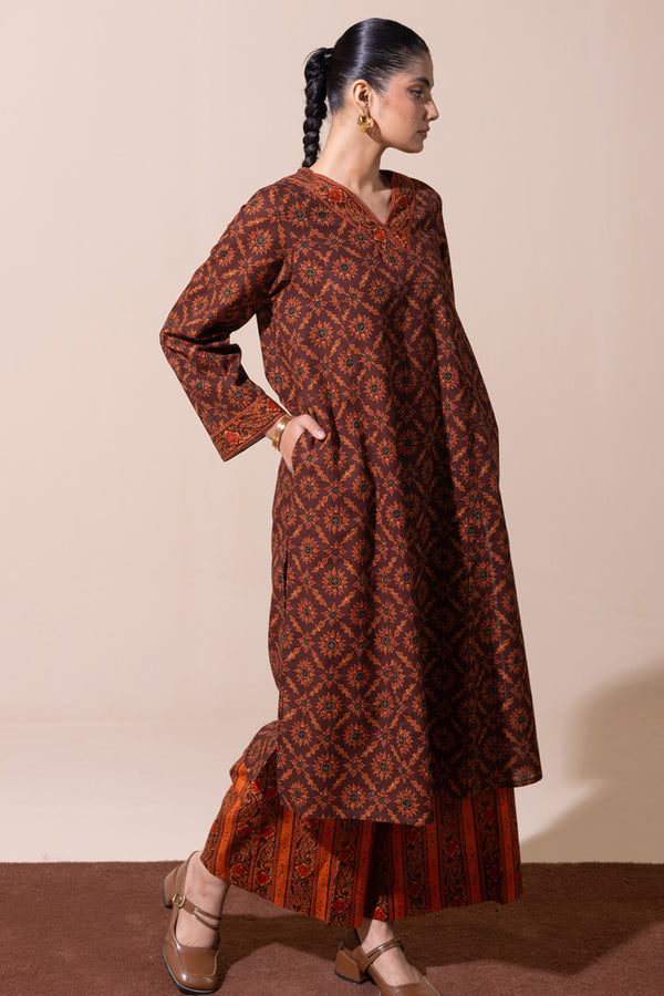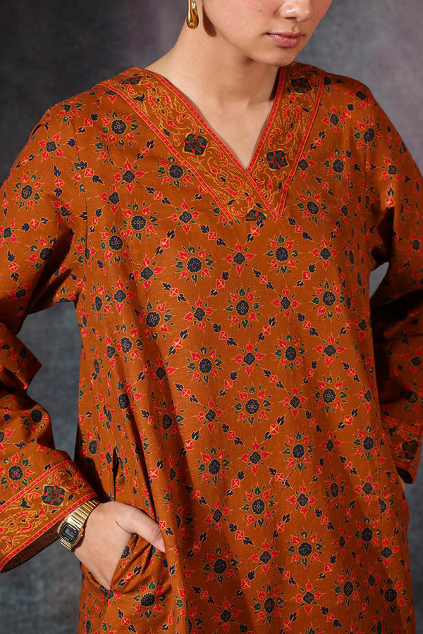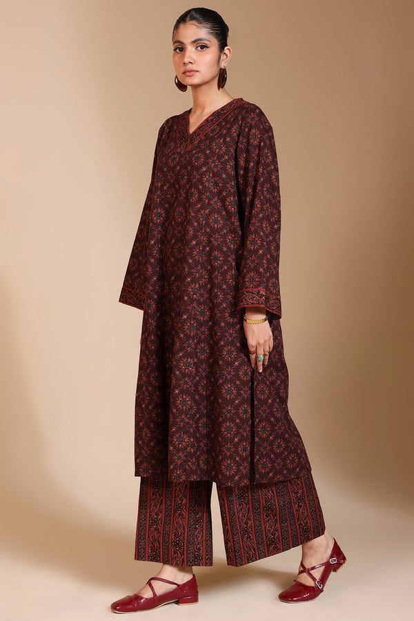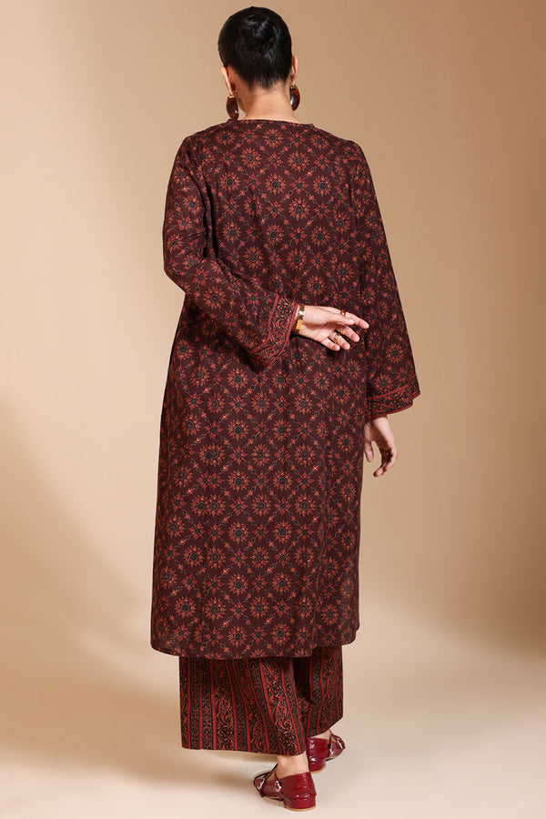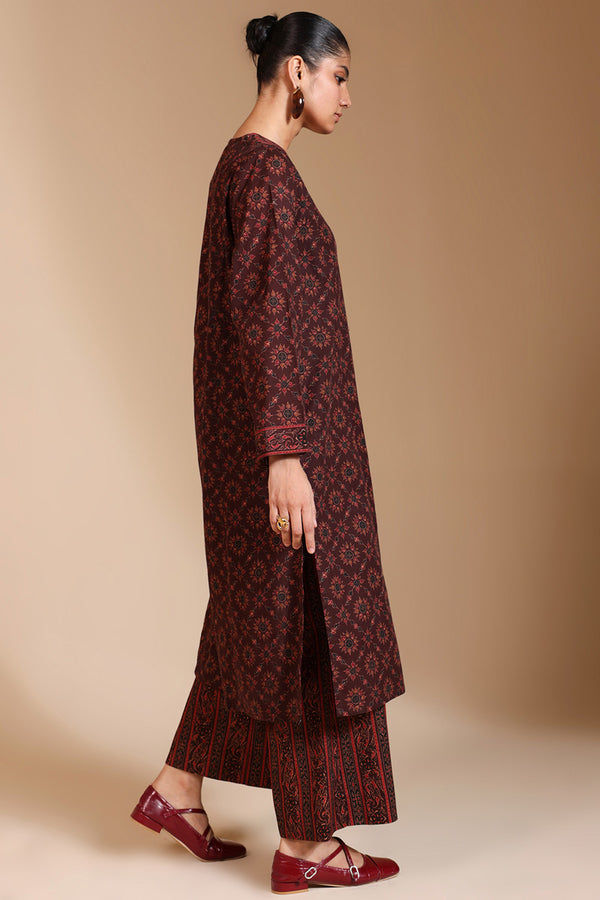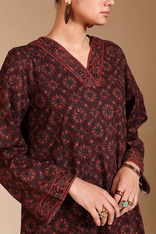 Classic-fit printed shirt with a square neckline, adorned with gota lace detailing along the neckline and sleeve hems. Paired with matching printed culottes for a look that blends tradition with modern ease.