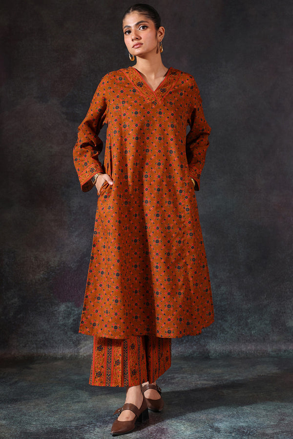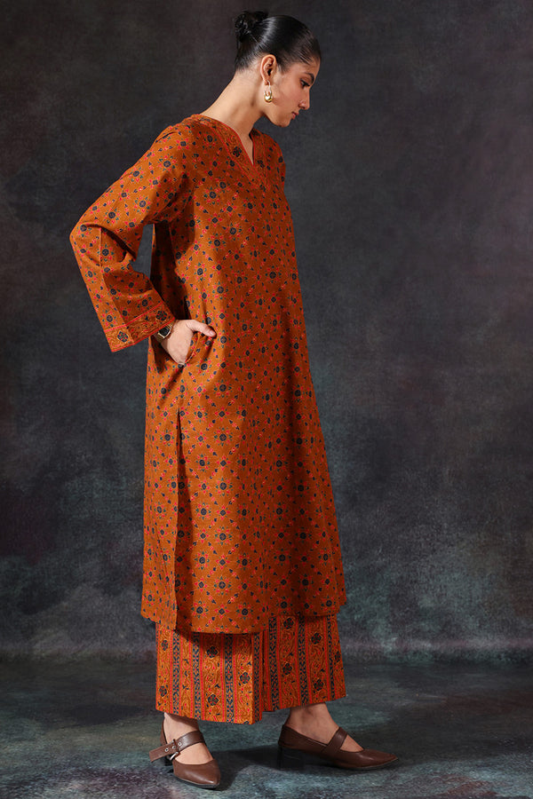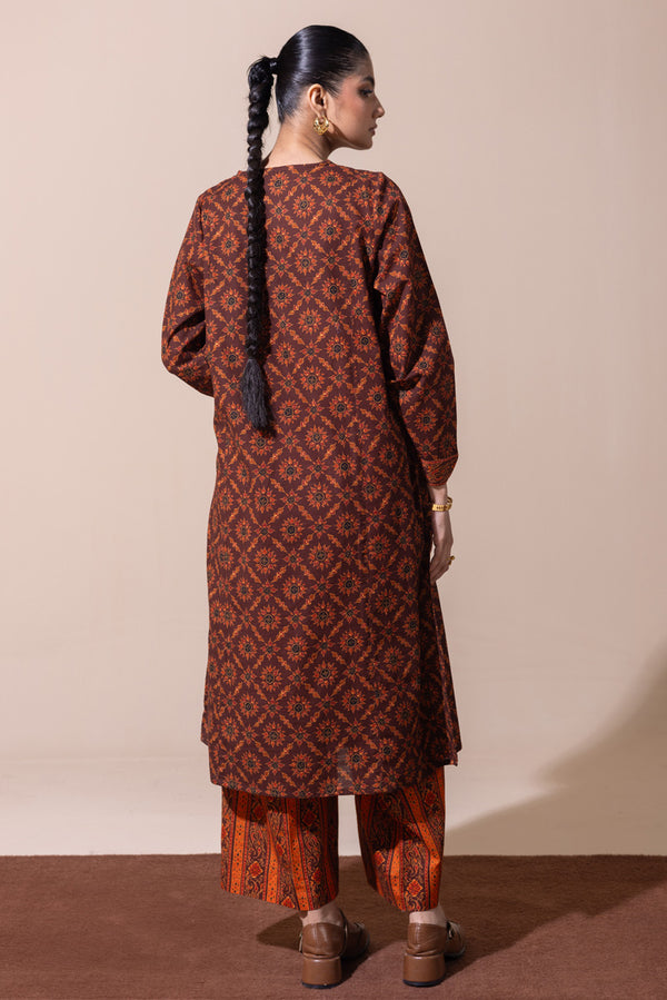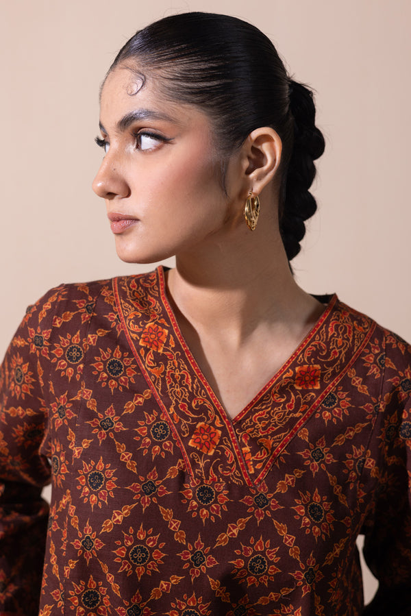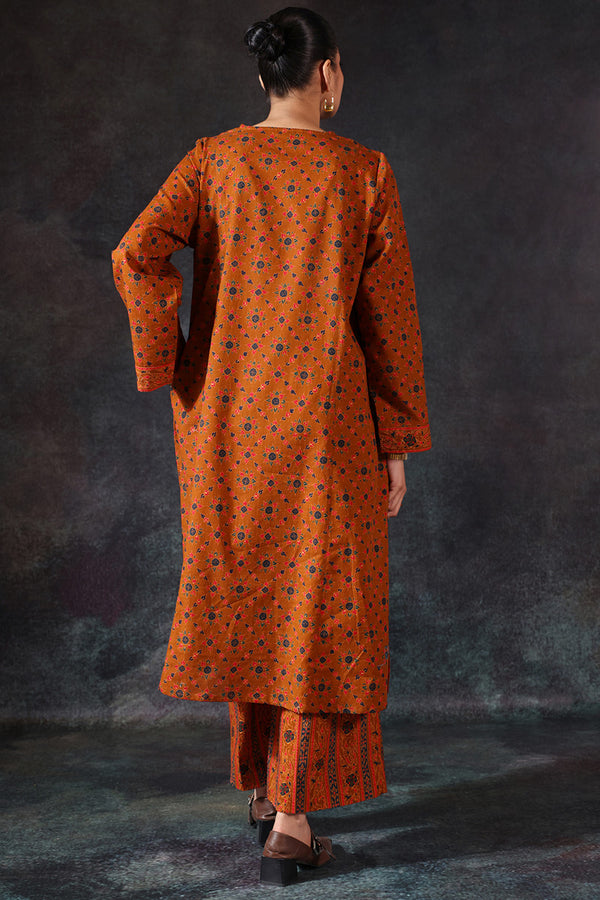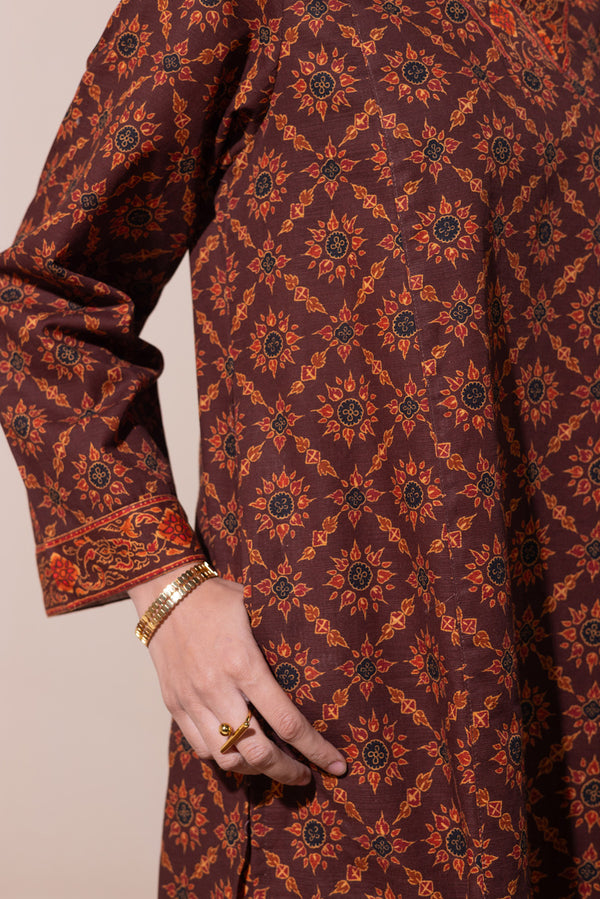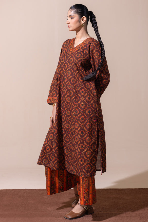 Classic-fit printed shirt with a square neckline, adorned with gota lace detailing along the neckline and sleeve hems. Paired with matching printed culottes for a look that blends tradition with modern ease.