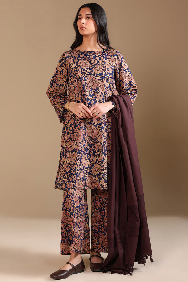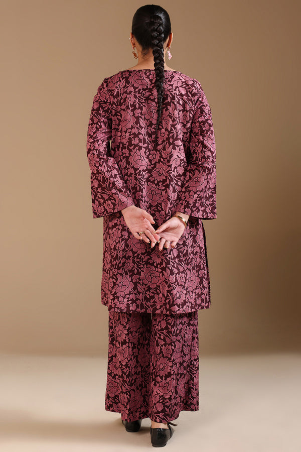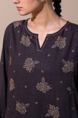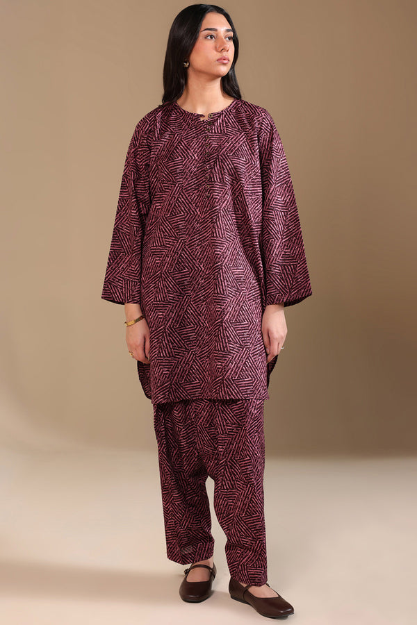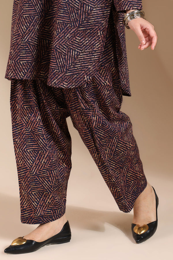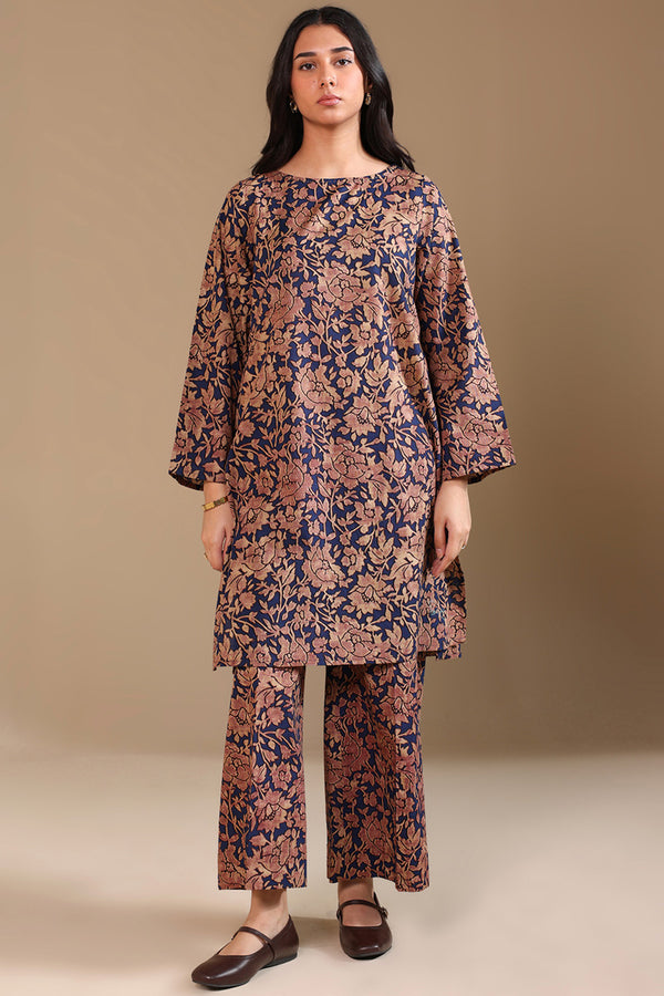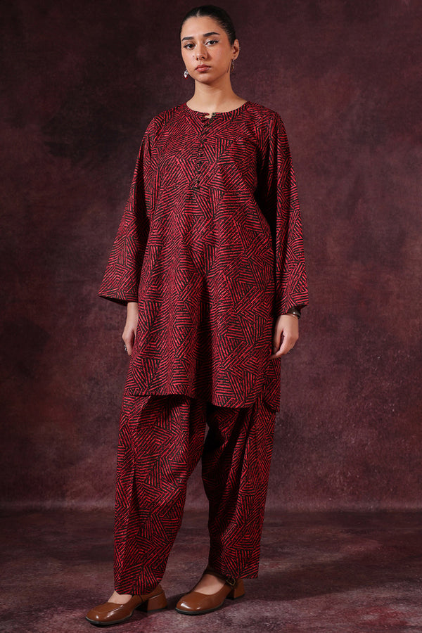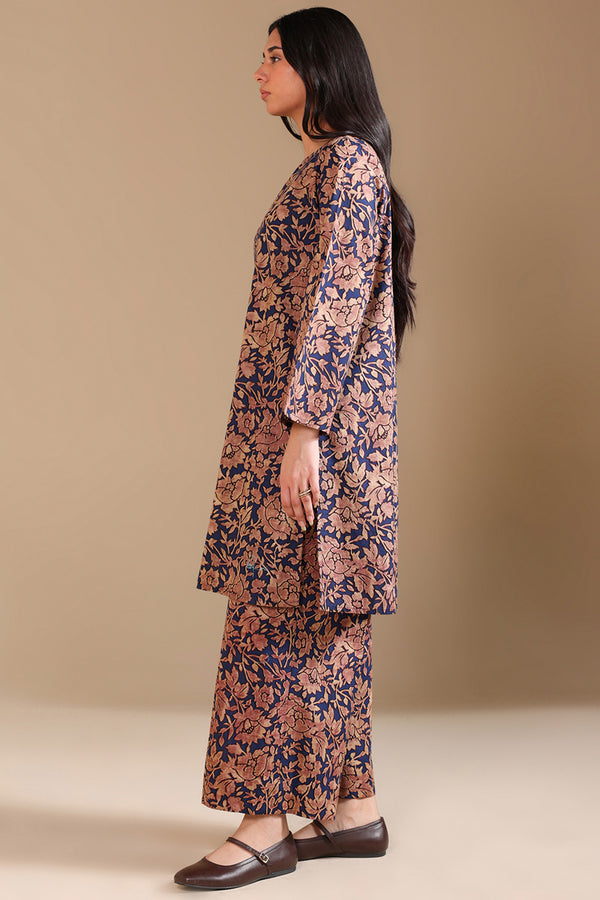 Classic-fit printed shirt with a round neckline and V-slit, adorned with delicate stitching detail. Paired with matching printed culottes for a relaxed yet refined look.