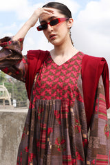 Classic printed flared dress with a V-neckline and gathers on the front and back for a flowy silhouette.