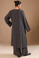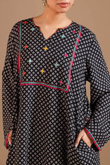 Relaxed-fit printed shirt with a round neckline and V-slit, adorned with thread embellishments on the bodice. Featuring drop shoulders and side pockets, paired with matching printed culottes.