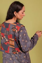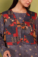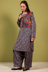 Classic-fit printed shirt with a round neckline and rounded hem, paired with a matching printed farshi shalwar. The set is completed with a printed, front-open sleeveless koti featuring button detailing for a classic look.