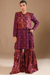 A classic-fit printed shirt adorned with delicate embellishment on the neckline and sleeve hems. Paired with a printed sleeveless open-front koti featuring a low band neckline and frill-edged sleeves. Styled with a matching printed gharara for a coordinated traditional look.