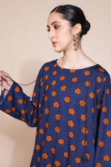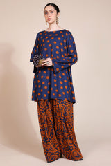 Relaxed-fit printed shirt with a round neckline and side-tassels. Designed with a short round hem for an easy, airy fall. Paired with a complementary printed farshi shalwar for a classic look.