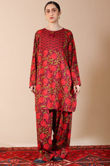 Classic-fit vibrant printed shirt with a round neckline, adorned with tassel detailing. Features side pockets for style and functionality. Paired with a matching printed farshi shalwar.