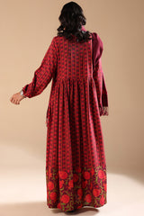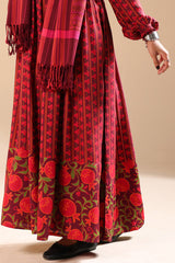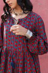 A long flared printed dress with a round neckline and tassel detailing. Gathers around the waist create a flowy silhouette, while gathered sleeve hems add a touch of soft volume.
