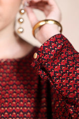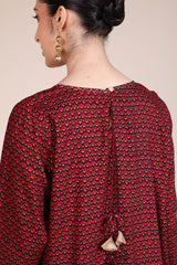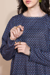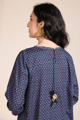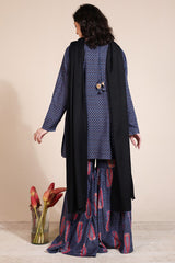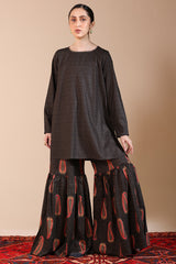 Classic-fit gold-printed short shirt with a round neckline, adorned with delicate stitching detail. Designed with a buttoned sleeve slit for a refined finish. Paired with a complementary gold-printed gharara.
