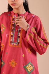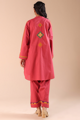 Appliqué classic-fit shirt with a low band neckline and a buttoned front placket, adorned with detailed appliqué and embroidered work. Finished with a round shirt hem. Paired with a classic-fit shalwar showcasing matching appliqué and embroidered detailing.