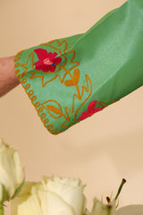 Embroidered classic-fit shirt with a low band neckline, adorned with delicate stitching details. Paired with classic culottes for an understated look.