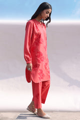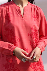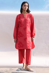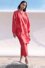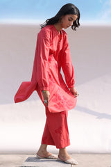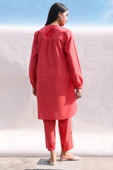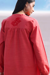 Classic-fit embroidered shirt with a low band neckline and v-slit, adorned with crochet lace detailing along the neckline and sleeve hems. Designed with gathers on the shoulders and back for a softly flared silhouette, finished with cuffed sleeves and a rounded hem. Paired with embroidered culottes.