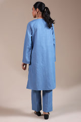 Sashiko embroidered paneled shirt with a V-neckline, adorned with delicate stitching along the neckline and sleeve hems. The Sashiko patterns elevate the look. Paired with straight-fit trousers.