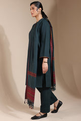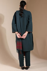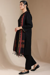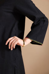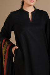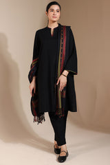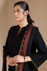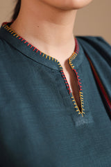 Classic-fit shirt with a round neckline and V-slit, adorned with colorful stitching along the neckline and sleeve hems. Paired with straight-fit trousers and styled with a jacquard dupatta for a vibrant, composed look.