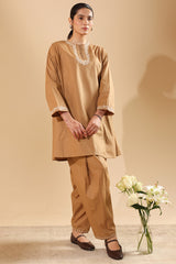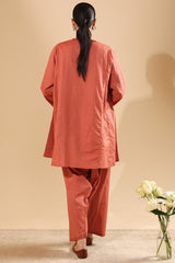 Embroidered paneled kurta with a round neckline, adorned with delicate pleats and button detailing. Subtle embroidered accents enhance the neckline and sleeve hems. Paired with a classic-fit shalwar, finished with embroidered borders.