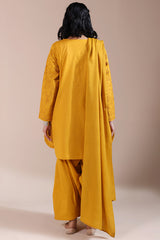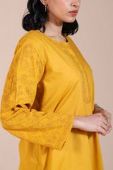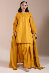 Classic-fit embroidered shirt with a round neckline adorned with delicate embroidery along the neckline, sleeves, and side slits. Paired with a farshi shalwar for a refined, traditional look.