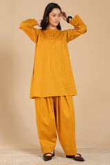 Embroidered classic-fit paneled kurta with a low band neckline and a buttoned front placket. Paired with a classic-fit shalwar, finished with embroidered detailing at the ankle hemline.