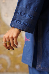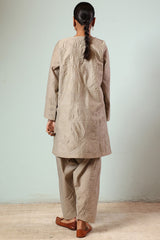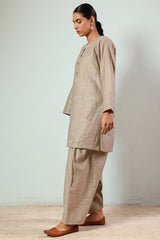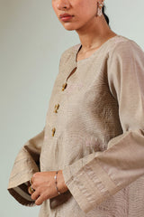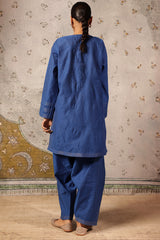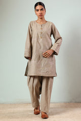 Embroidered classic-fit shirt with a round neckline and V-slit, adorned with gota tassel detailing. Paired with a khula poucha shalwar, finished with stitching accents along the hemline.