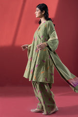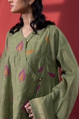 Embroidered angrakha-style kurta with button detailing and fine stitching accents along the sleeve hems. Paired with an embroidered farshi shalwar and styled with a lurex-striped dupatta for a refined festive finish.