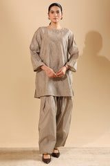 Embroidered classic-fit shirt with a square neckline, adorned with delicate embroidered detailing along the neckline and sleeve hems. Paired with a classic farshi shalwar, finished with refined stitching details along the borders.
