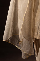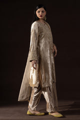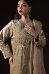 Luxurious velvet shirt adorned with delicate embroidery, enhanced with gota detailing on the bodice and sleeve hems. Paired with a velvet pegged shalwar and styled with an organza dupatta finished with gota lace and tassel detailing for a festive statement look.