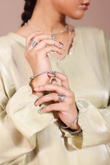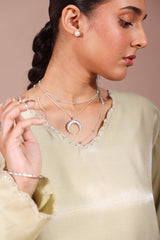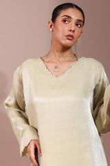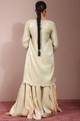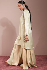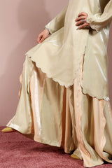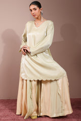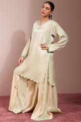 Crafted from luxurious fabric, this classic-fit shirt features scalloped edges on the neckline, sleeves, and hem, adorned with delicate sequin detailing. Paired with a pleated sharara, it exudes festive grace.