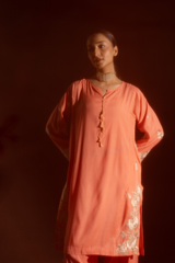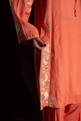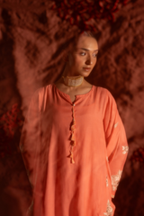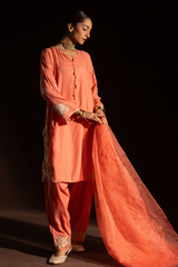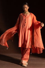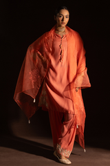 Embroidered classic-fit paneled kurta, detailed with tassel accents at the neckline. Paired with a classic-fit shalwar, finished with embroidered borders. Styled with an embroidered organza dupatta, adorned with delicate tassel detailing for a refined festive look.