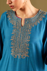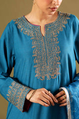 Embroidered speckled-base shirt crafted with a refined finish, enhanced by delicate embroidery around the neckline and sleeve hems. Paired with tailored straight-fit trousers and a soft inner for added comfort. Styled with an airy organza dupatta, enriched with lurex accents and finished with kiran lace edging.
