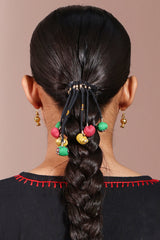 A playful scrunchie adorned with hanging fabric balls made with love, finished with gilded detailing, giving life to every thread.