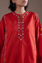 Hand-embroidered paneled shirt with a round neckline and V-slit, adorned with delicate embroidered detailing. Designed with cuffed sleeve hems. Paired with classic culottes finished with subtle stitching detail along the hemline.