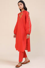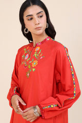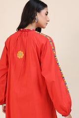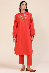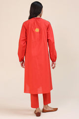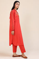 Hand-embroidered relaxed-fit shirt with a low band neckline and V-slit, featuring vibrant embroidery on the bodice, sleeves, and back. Designed with cuffed sleeves for a polished finish. Paired with straight-fit trousers for a timeless look.