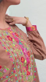 Hand-embroidered detailed shirt adnored with buttons along the front placket and intricate hand-embroidery on the bodice. Designed with cuffed sleeves, side pockets, and a rounded hem for ease. Paired with a farshi shalwar accented with delicate stitching along the ankle hemline for a timeless finish.