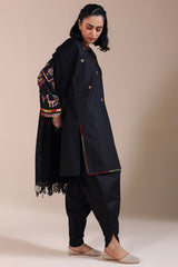 Handcrafted classic-fit shirt with a round neckline and V-slit, adorned with vibrant embroidered detailing. Paired with a classic tulip shalwar for a graceful, balanced look.