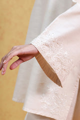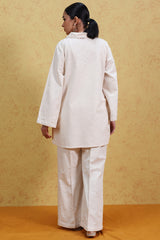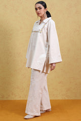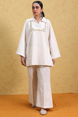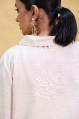Handcrafted classic-fit short shirt featuring a collar neckline accented with loop detailing. Delicate yet vibrant embroidery highlights the bodice, complemented by subtle self-embroidered detailing throughout. Paired with self-embroidered culottes for a cohesive look.
