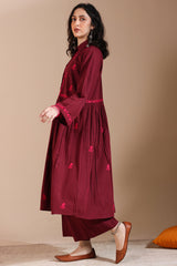 Hand-embroidered classic-fit frock with a collar neckline and a buttoned front placket, featuring a subtle front slit for ease. Designed with gathers along the empire waist to create a soft flare. Paired with culottes for a balanced, modern look.
