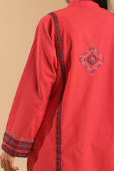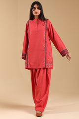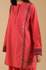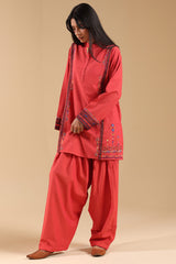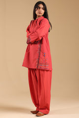 Hand-embroidered classic-fit paneled shirt with a low-band neckline and buttoned front placket, enhanced with fine stitching details. Delicate embroidery is elevated with subtle sequin accents. Paired with an embroidered Khula-pouncha shalwar.