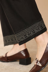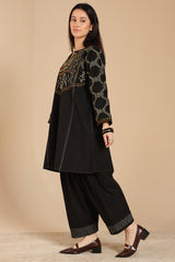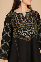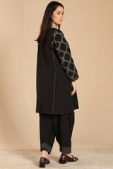 Hand-embroidered paneled kurta with a round neckline and V-slit, adorned with vibrant embroidered detailing. Paired with a classic-fit shalwar, finished with embroidered accents.