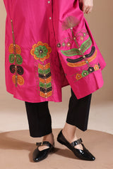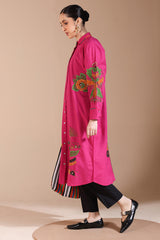 Embroidered shirt with a collar neckline and a button-down front, finished with delicate stitching along the neckline. Designed with drop shoulders and cuffed sleeves for a relaxed look. The embroidered motifs are enhanced with subtle sequin detailing for a refined touch.
