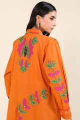 Embroidered shirt with a collar neckline and a button-down front, finished with delicate stitching along the neckline. Designed with drop shoulders and cuffed sleeves for a relaxed look. The embroidered motifs are enhanced with subtle sequin detailing for a refined touch.