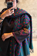Speckled-base classic-fit appliquéd shirt with a round neckline, accented with delicate stitching along the neckline and sleeve hems, finished with a subtle keyhole at the back. Paired with classic culottes, enhanced with coordinated appliqué and embroidered accents.