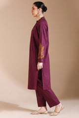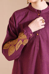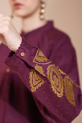 Appliquéd classic-fit shirt with a low band neckline, adorned with delicate stitching detail and a buttoned front placket. The cuffed sleeves features appliqué and embroidered work, finished with crochet lace along the hems. Paired with speckled straight-fit trousers.