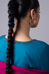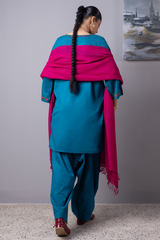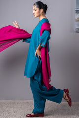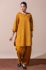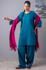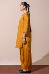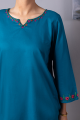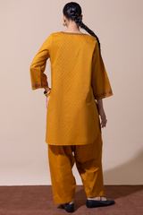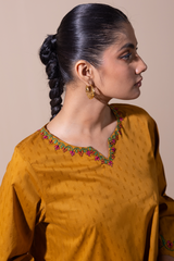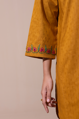 Classic-fit textured shirt with a round neckline and V-slit, adorned with delicate embroidery along the neckline and sleeve hems. Features a rounded hem for a graceful finish. Paired with a classic-fit shalwar.
