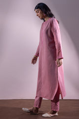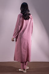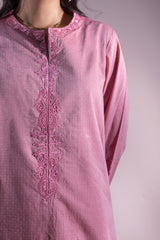 Embroidered classic-fit shirt with a round neckline and V-slit, adorned with delicate embroidered detailing on textured base for a luxurious touch. Paired with straight-fit embroidered trousers featuring side slit at the hemline.