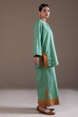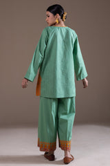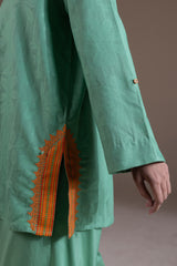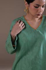 Classic-fit jacquard shirt with a V-neckline, adorned with delicate crochet detailing. Finished with jacquard pattern and embroidered accents along the side slits. Paired with classic culottes, detailed with jacquard and embroidered borders.